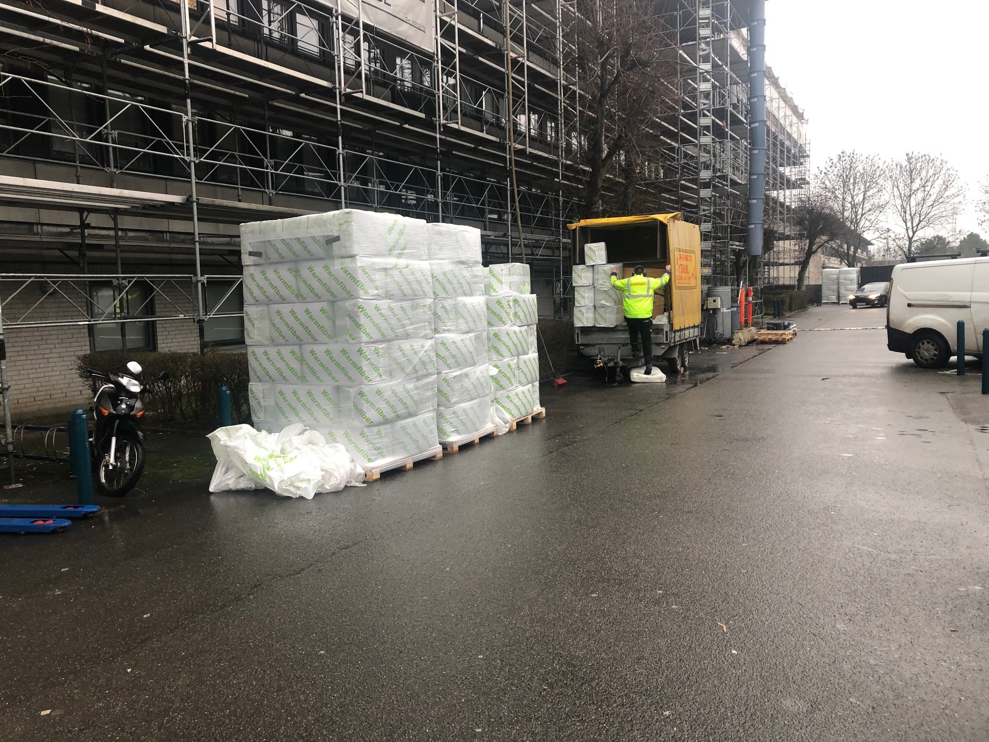 Vi starter med at lægge ISOVER-ruller ud langs tagudhænget for at sikre ventilationsåbningerne. Derefter udlægger vi ISOVER granulatet med vores specialmaskine, som nemt og hurtigt fordeler isoleringsmaterialet jævnt ud over hele loftet.